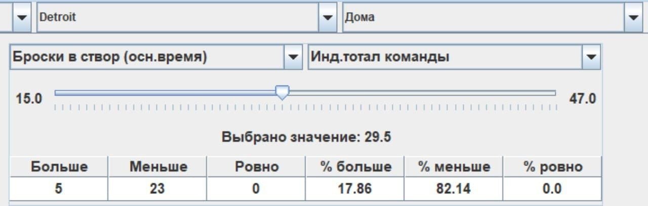 Начну с «Детройта». Это команда, которая наносит меньше всех бросков в домашних матчах, но при этом, что удивительно и не слишком логично, довольно активно играет на выезде. Стандартный ИТ «Ред Уингс» дома — 29,5 броска, а проходимость ТМ составила аж 82,14% (23 плюса против пяти лузов). Если расширить ТМ до 28,5, чтобы увеличить коэффициент, то проходимость всё равно отличная — 71,5%.