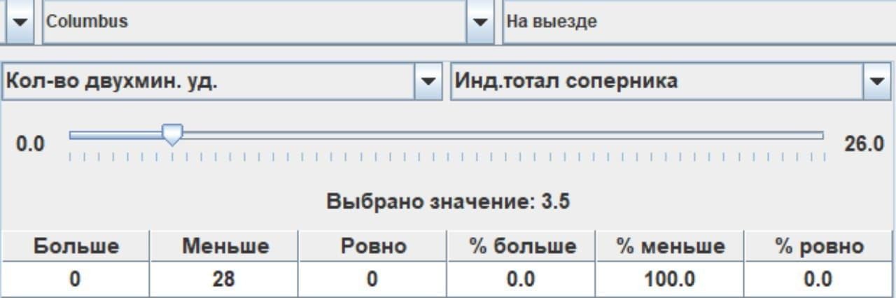 Но самый топовый тренд всего материала — ставки на ИТМ 3,5 малых штрафа соперника «Коламбуса», когда «Джекетс» играли на выезде. Проходимость составила…100%, 28 из 28.