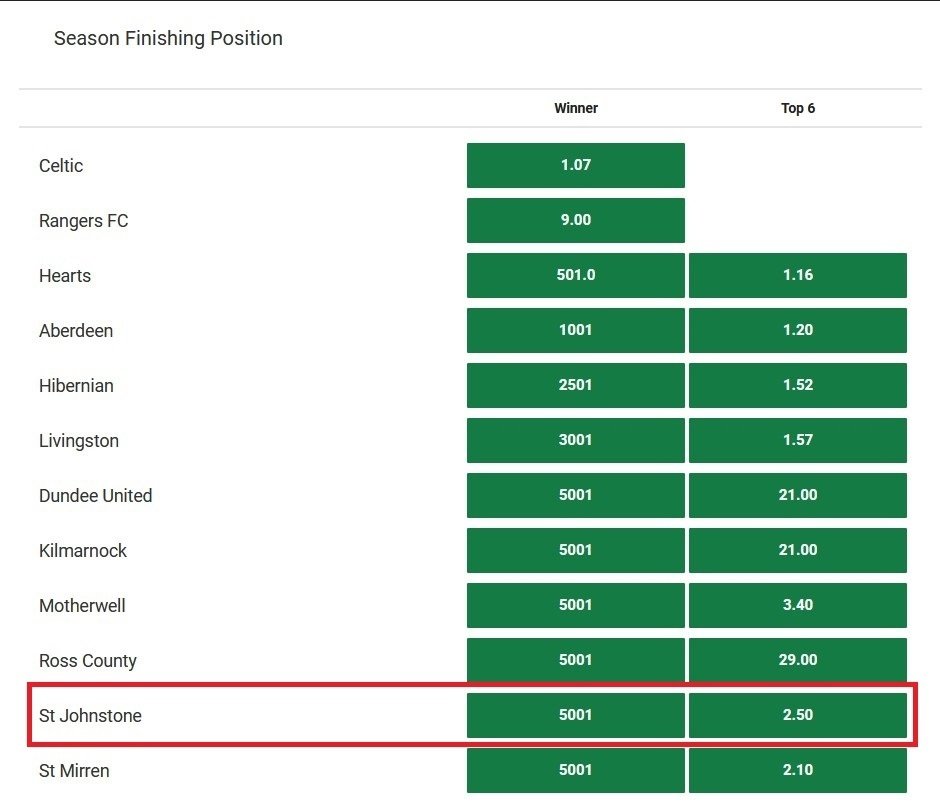 Аналитики из Unibet дают на попадание клуба в топ-6 коэффициент 2.50, что в условиях дичайшей конкуренции за место в первой половине турнирной таблицы очень даже неплохо. А вот российские букмекеры в «Сент-Джонстон» не верят, котируя попадание в чемпионскую группу на 3.00+.