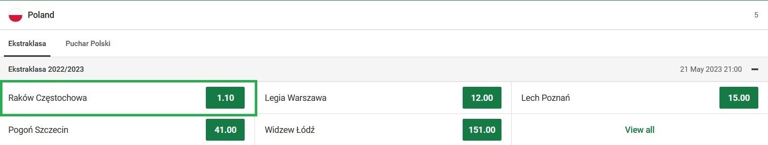 В Unibet близки к закрытию линии на «Ракув», но ставки на чемпионство клуба всё ещё принимаются... За коэффициент 1.10 — чуть больше, чем на чемпионство «Баварии» в Германии.