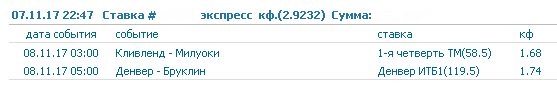 Денвер проводит сейчас серию из домашних матчей, завтра для команды стартует четвертый матч подряд на своей арене. Статистика побед поражений в этой серии 2 победы над Майами Хит и Торонто Рэпторс и проиграла команда только Голден Стэйт. Завтрашний соперник очень хорошо заявили о себе уже в начале сезона, но потом у Нетс пошла череда поражений, и лишь сегодня команда прервала свою неудачную серию из четырех поражений подряд и выиграла на выезде у Финикса. Денвер хороши в домашних играх против Бруклина в очных встречах, команда показывает стабильно хорошую результативность, в добавок клуб и сейчас против других соперников играет результативно, на фоне последних неудачных игр Бруклина напрашивается ставка на результативность хозяев паркета. Еще можно присмотреться к общей результативности двух команд, да Бруклин Нетс явно сбавили в своей игре но результативность у игроков Нетс никто не отменял, за последние 10 игр в их исполнении на низ команда сыграла только два раза, это на выезде против Нью-Йорка где Нетс забросили всего лишь 86 очков и сегодняшняя выездная победная игра против Финикса - 98 очков. Ставка на общий тотал 229.5 неплохо смотрится для такой игры в исполнении Денвера и Бруклина. Неделю назад обе команды уже играли друг с другом и та игра завершилась со счетом 111:124.