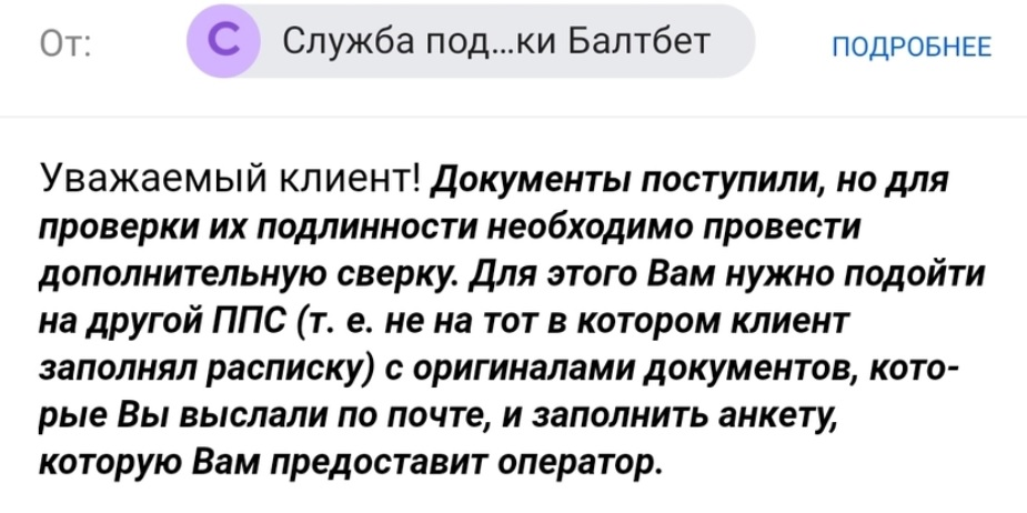 Игроку снова предложили лично явиться с паспортом, но уже в другой пункт приёма ставок «Балтбет»! На наши вопросы, почему к клиенту такое отношение, представители букмекера ответили, что это вполне СТАНДАРТНАЯ процедура и ему нужно просто следовать инструкциям.