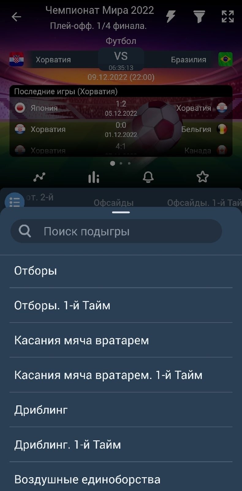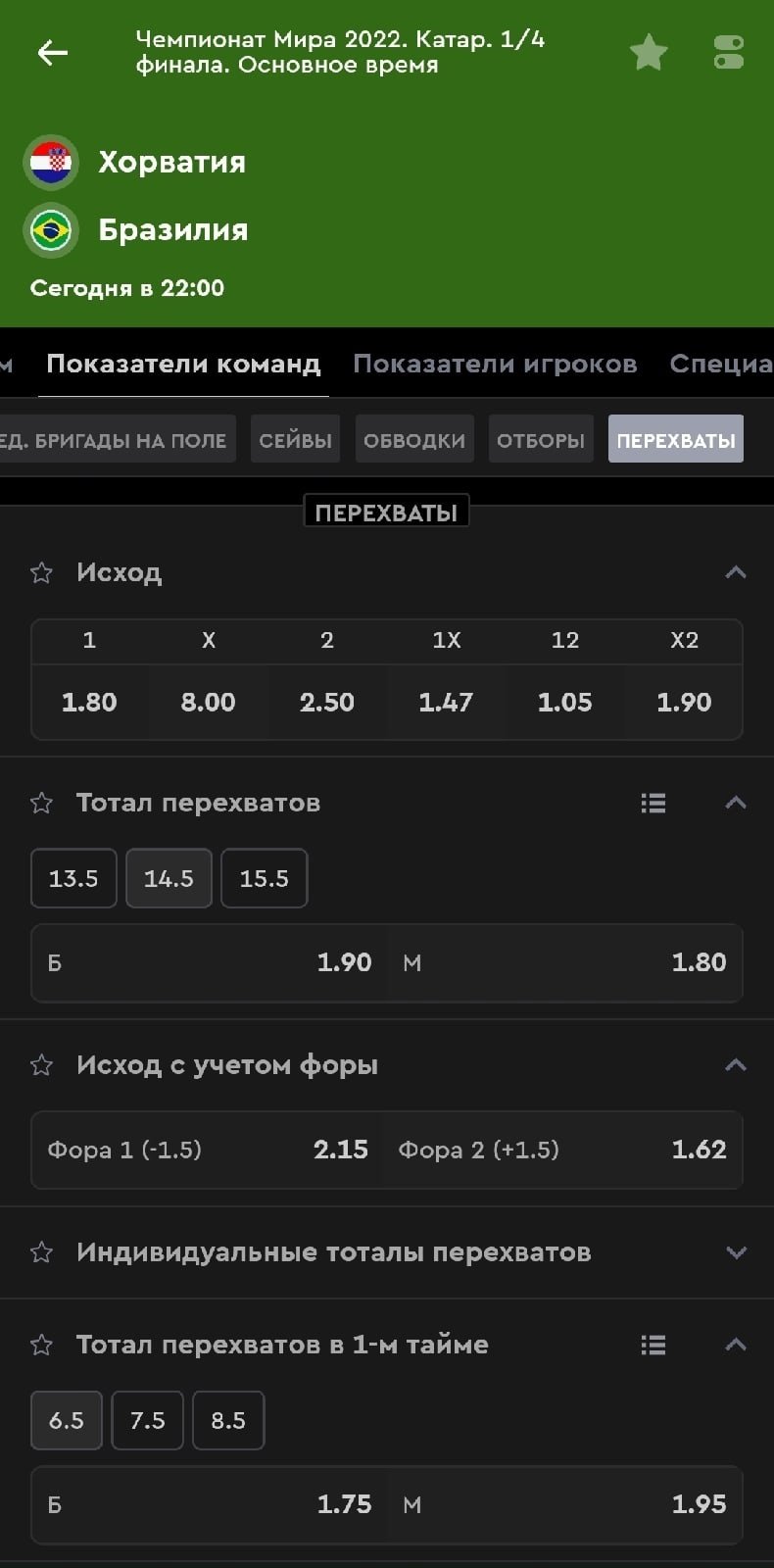 Отметим и Winline, у которой есть роспись на статистику игроков (отборы, перехваты, касания), но нет общей линии по матчу — не совсем то, что нас интересует, но тоже круто.