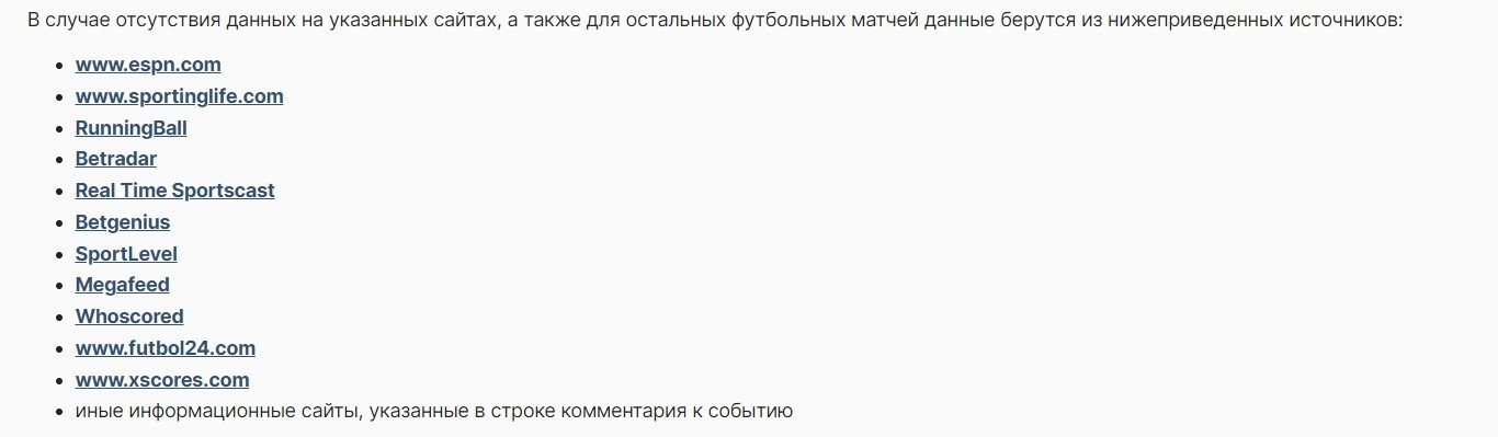 У «Фонбета» и PARI и вовсе в правилах есть интересная приписка, что в случае отсутствия статистических данных на официальном сайте расчёт может проводиться по данным одного из перечисленных ресурсов.