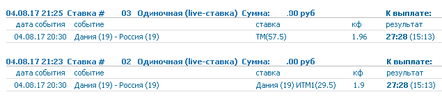 04.08.17 20:30 | Дания (19) - Россия (19) | 1>2 | 2.3 |