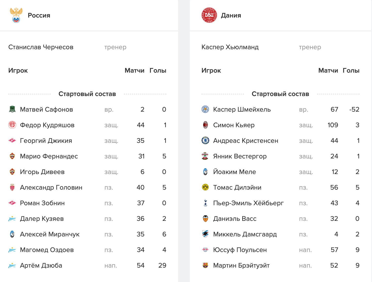 20:56 Составы сборных России и Дании: Семенов в запасе, Марио, Дзюба и Сафонов в старте!