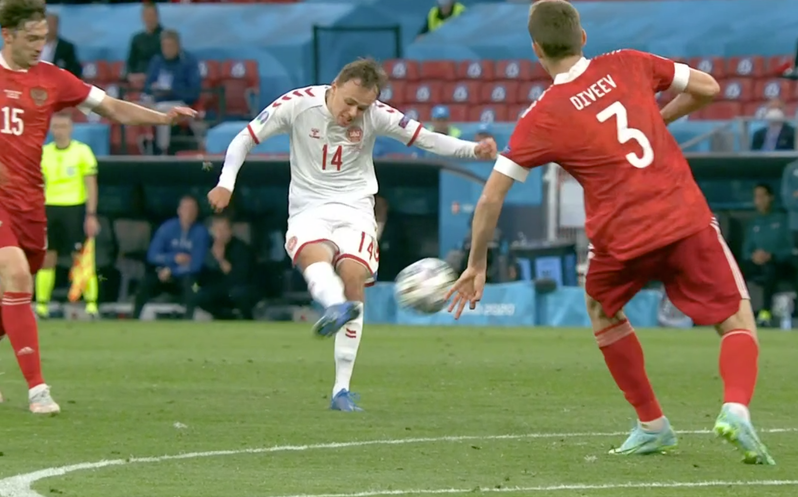 18' ГОЛОВИН! КАКОЙ МОМЕНТ! Перехват наших в центре поля, Головин подхватывает мяч и за счет партнера ныряет между тремя датчанами - удар из штрафной, прямо в Шмейхеля! Эххх!