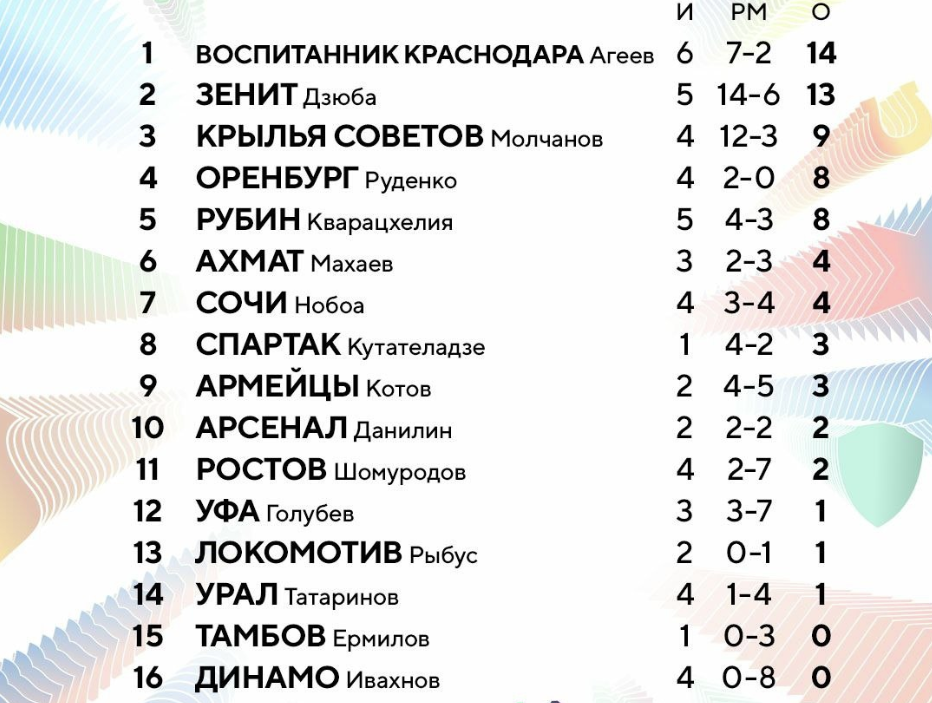 Напомним, что главная идея турнира – доиграть нынешний сезон РПЛ с момента, где он прервался, то есть с 23-го тура. Всего в лиге будет два зачета: первый – доигровка чемпионата, второй – отдельная таблица по 8 матчам в PES. В настоящий момент турнирная таблица выглядит так: