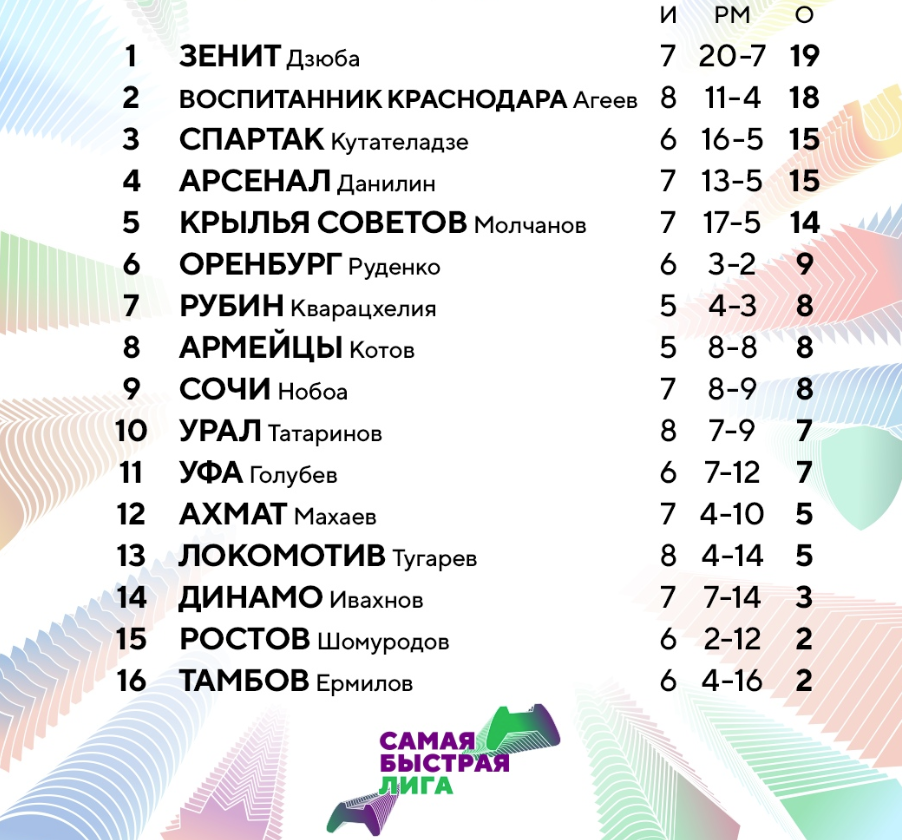 Футболисты РПЛ продолжают с пользой проводить время на карантине, играя в киберфутбольной «Самая быстрая лига». В настоящий момент турнирная таблица выглядит так: