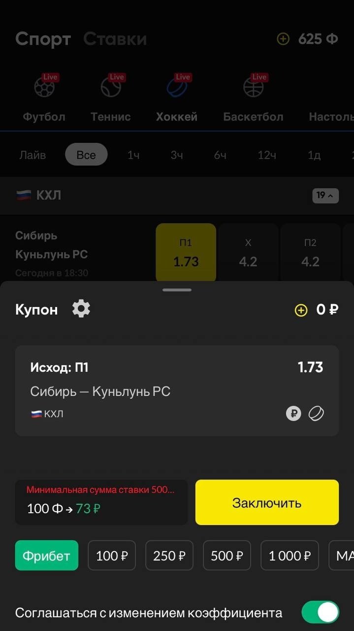Счёт был порезан, а потому весь фрибет в 500 рублей проставить не дали — лимиты убили до 100 рублей. Но и 100 рублей проставить не получится — по правилам большинства акций, фрибет можно проставить только разом и целиком.
