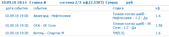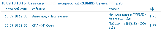 10.09.18 19:00 Авангард - Нефтехимик Точное кол-во шайб в матче : 3-5 - Да 1.76