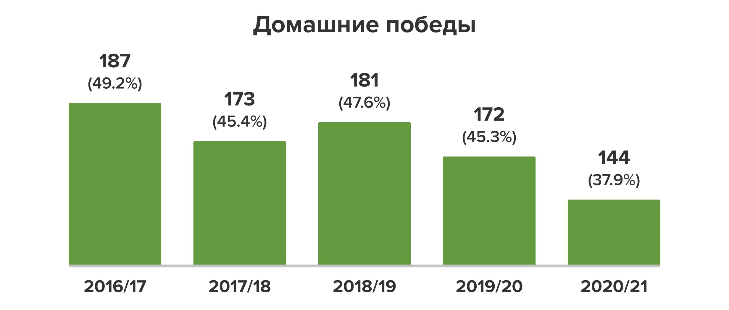 «Ковидный» сезон показал самый низкий процент домашних побед за последние пять лет в АПЛ. Однако это был лишь катализатор общей пятилетней тенденции в чемпионате. Хозяева поля побеждают с каждым годом всё реже.