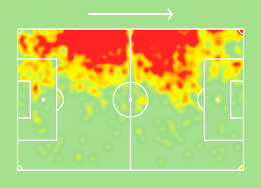 Первая проблема — выбор заведомо проигрышной позиции в игре без мяча. Он не играет в отбор в ключевых зонах, выступая в роли поддержки выдвигающимся на фланг опорникам и центрдефам.