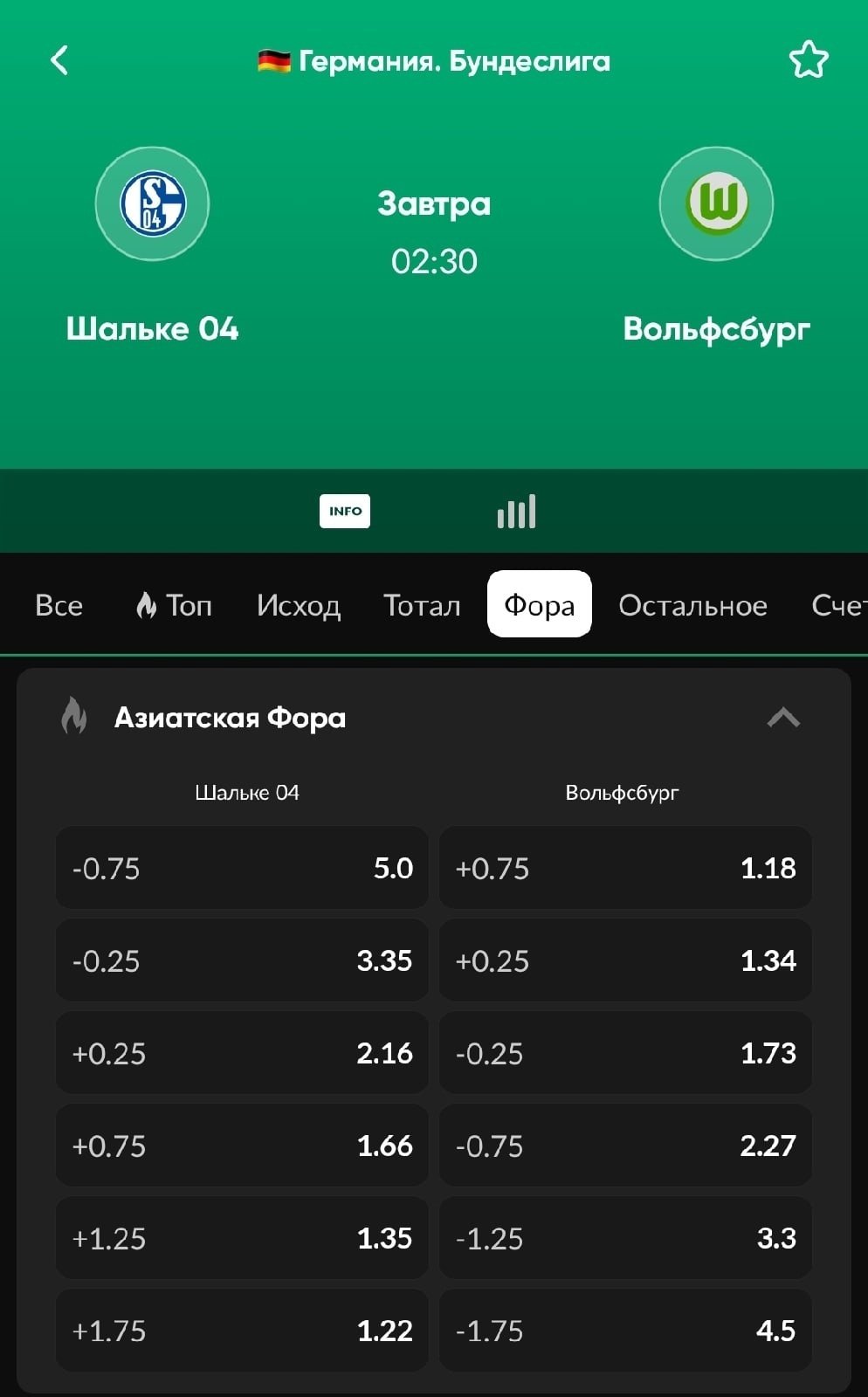 Думаю, понятнее должно быть на конкретном примере. Возьмём матч Бундеслиги между «Шальке» и «Вольфсбургом» — на победу гостей с форой (−0,75) BetBoom предлагает 2.27.