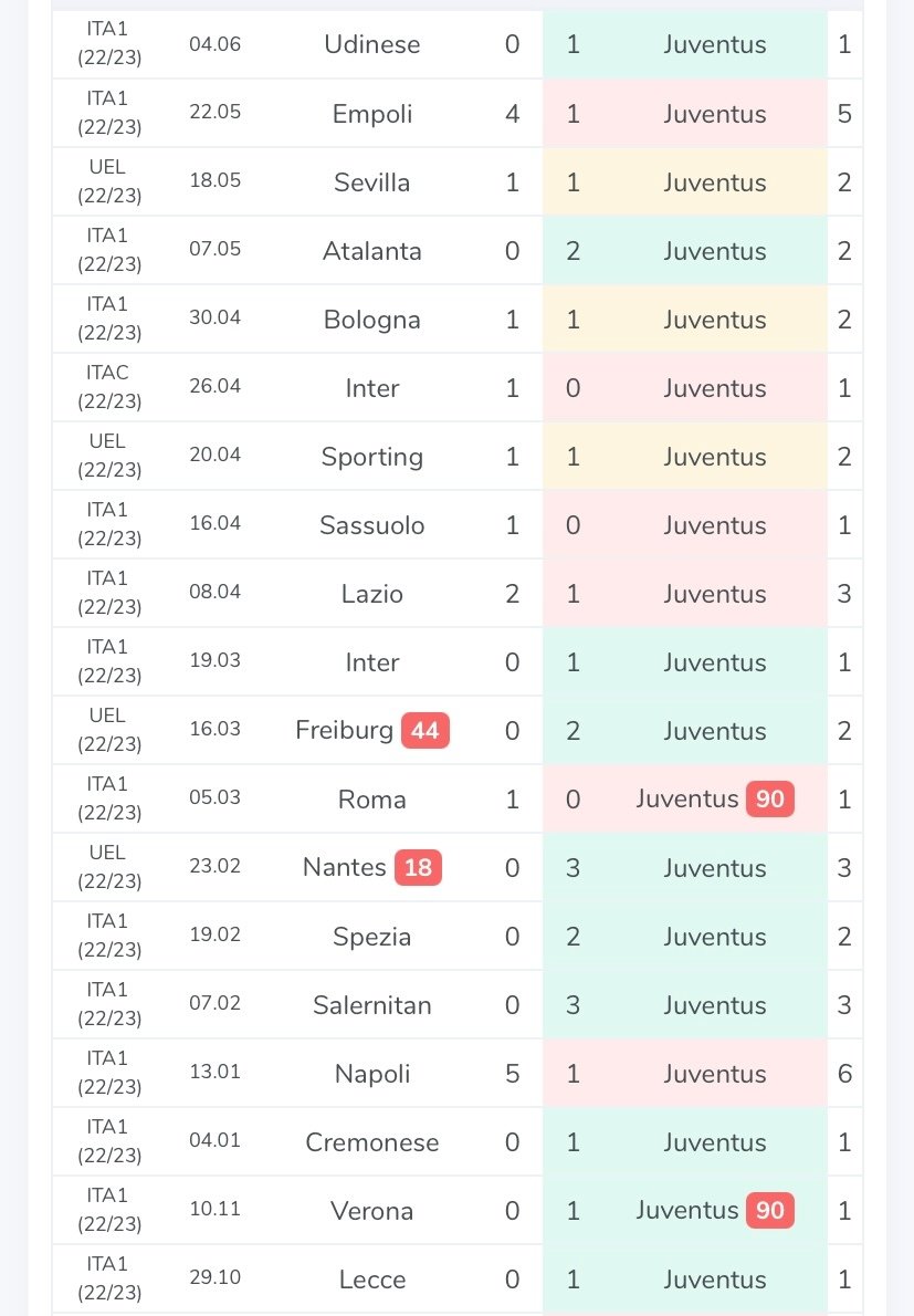 С 2014-го по 2019-й и с 2021-го по текущий момент «зебр» возглавляет Массимилиано Аллегри. Массимо ставит своим командам аккуратную, прагматичную и от этого визуально скучную игру, в которой даже 4 гола за 90 минут — большая редкость. Ещё больше «Ювентус» закрывается в гостевых матчах, где средний тотал забитых мячей равен 2,14 — по 1,07 гола у туринцев и их соперников. Просто взгляните на итоговый счёт в последних выездных встречах «Юве»: