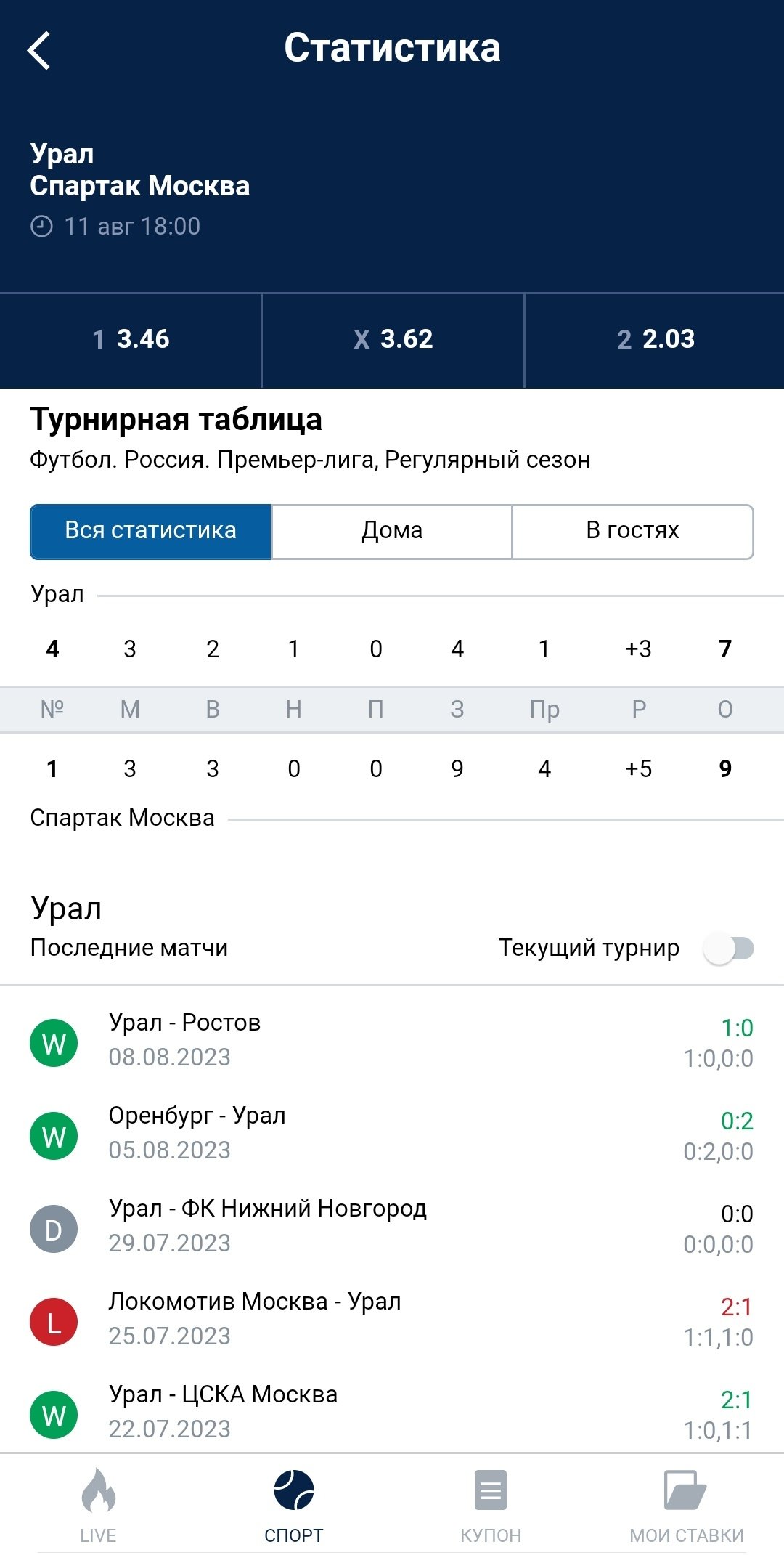 Всего лишь один тык на «Статистику» прямо с главной страницы — и полный фарш: кэфы на основные исходы, турнирная таблица с фильтром «дом/выезд», список матчей обеих команд, личные встречи. У многих контор есть статистика на странице события (например, у «Лиги Ставок»), но так круто эта фишка не реализована, наверное, ни у кого: