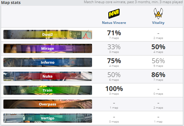 Статистика маппула больше склоняется в сторону NAVI. Но сильных карт у команд не так много, поэтому один из матчей вполне может пройти на какой-то нейтральной карте типа overpass или vertigo.