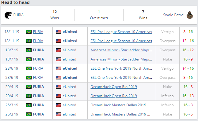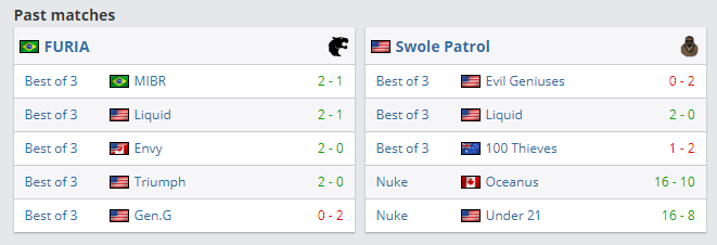 Бразильская команда FURIA Esports неплохо справляется с трудностями в группе. На её счету 2 победы, одна из них у Team Liquid. От первого места в группе её отделяют всего 5 раундов. Американский коллектив Swole Patrol ожидаемо занимает последнюю строчку в группе, но еще не все потеряно, так три очка у нее все-таки есть. Исход этого поединка решает очень многое для обеих команд. Стоит ждать напряженной борьбы, так как у каждой есть свои сильные карты. В последний раз FURIA Esports vs Swole Patrol (ex-eUnited) встречались в ноябре прошлого года. Тогда победу со счетом 2:0 по картам одержала американская команда. Кстати, сегодня ночью FURIA Esports предстоит сыграть против EG. Рекомендую посмотреть этот матч, вы почерпнете для себя много полезной информации. Началом матча FURIA Esports vs Swole Patrol запланировано на 19:00 по МСК.
