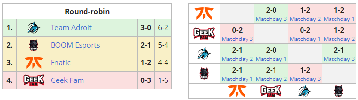 BOOM Esports и Fnatic заняли второе и третье места соответственно. В очном противостоянии победу одержала команда BOOM Esports (2-1). Fnatic сумела пробиться в плей-офф благодаря одной победе над Geek Fam, которая проиграла все свои встречи. Это очень непохоже на Fnatic, так как она практически всегда доминирует на своей сцене. Начало игры в 07:00 по МСК.