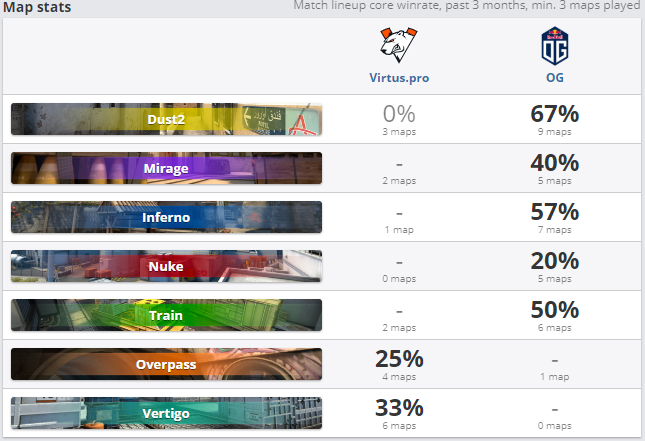 Многострадальные "медведи" на грани развала. В феврале и марте они сумели выиграть только в одном матче из семи. Последние пять игр завершились поражениями. У OG все наоборот - команда на подъеме, ей все чаще и чаще удается обыгрывать сильные коллективы и добиваться нужных результатов. Недавняя победа над G2 со счетом 2:0 это подтверждает. Статистика не играет большой роли. OG сильнее VP по всем фронтам. В последний раз команды играли между собой в декабре на LAN-турнире cs_summit 5. Матч завершился ничейный результатом 1-1 по картам. Начало игры в 15:25 по МСК.