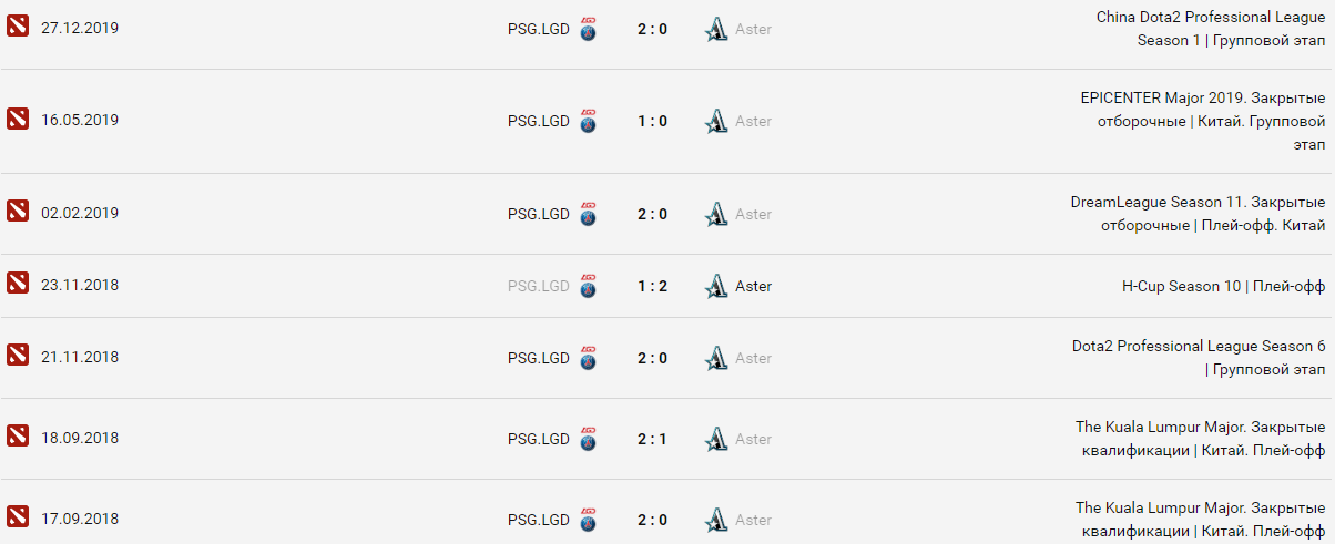 Новый сезон, новый групповой этап и новая встреча между командами PSG.LGD и Aster. В новом году PSG.LGD показывает хорошие результаты. На её счету победы в China Dota2 Professional League Season 1 и в китайском дивизионе WeSave! Charity Play. Но последние матчи команды вызывают вопросы. PSG.LGD проиграла четыре матча подряд. У Aster все наоборот, она находится в хорошей игровой форме и показывает стабильную игру. В шести последних встречах она одержала пять побед. По личным встречам большой перевес в пользу PSG.LGD (6-1). Последний актуальный матч датируется 27 декабря прошлого года. Остальные игры не стоит брать в расчет. Начало игры в 12:00 по МСК.