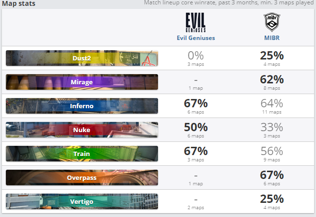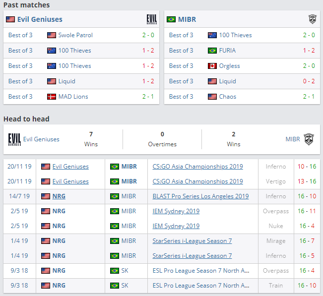 Evil Geniuses и MIBR пока занимает совсем не те позиции, которые ждут от них фанаты. Но если у EG еще есть право на ошибку, то у MIBR уже нет. EG провела два поединка (1 победа и 1 поражение). Как написано выше, сегодня она сыграет важный матч против FURIA. У бразильцев из MIBR ситуация хуже, они сумели победить только в одном матче, в остальных двух они потерпели поражения. Шансы пока есть у всех, а это значит все будут бороться несмотря на плохую игровую форму. По личным встречам у EG большое преимущество. На ее счету семь побед, а у MIBR всего две.