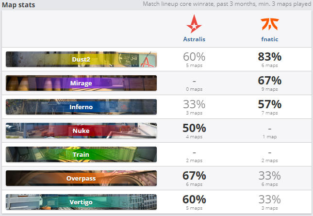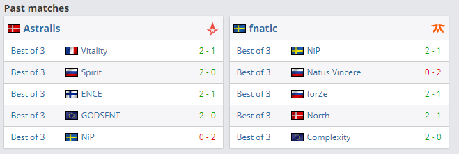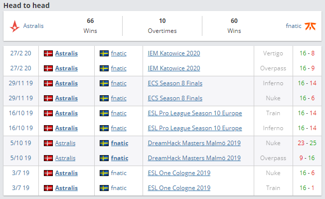 Между Astralis и Fnatic сыграно большое количество матчей и преимущество датской команды не такое большое. 66 побед у Astralis и 60 побед у Fnatic, но последние 6 поединков выиграла именно Astralis. Начало игры в 15:25 по МСК.