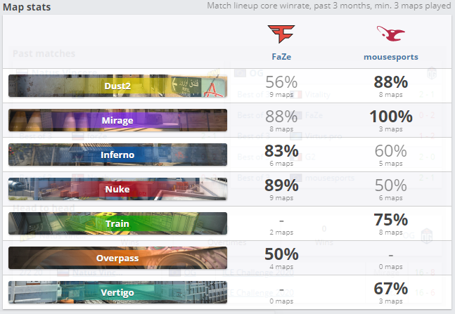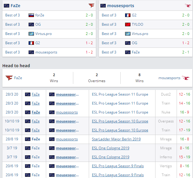На бумаге mousesports на данный момент выглядит сильнее, чем FaZe Clan. У них сильнее маппул, а также психологическое преимущество. "Мышки" обыгрывали FaZe Clan восемь раз и только два раза уступали. В 2020 году команды сыграли между собой три карты (все в первом групповом этапе), из которых две выиграла mouz. Начало игры в 23:00 по МСК.