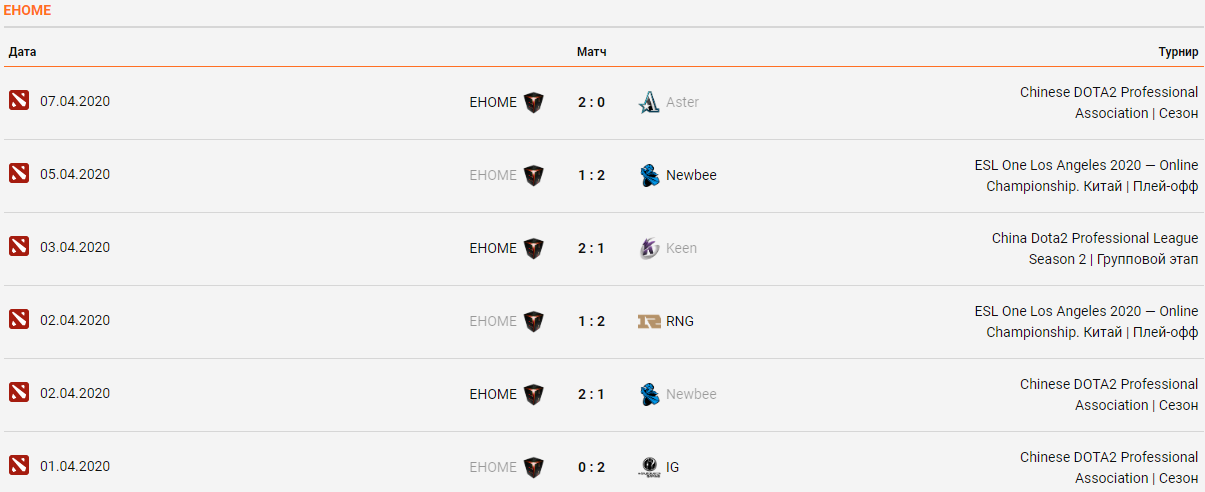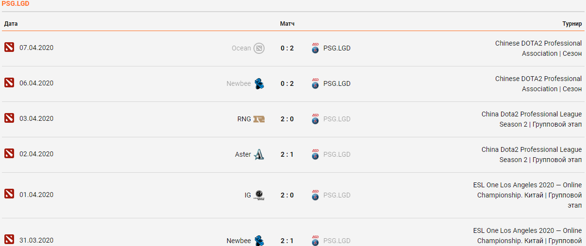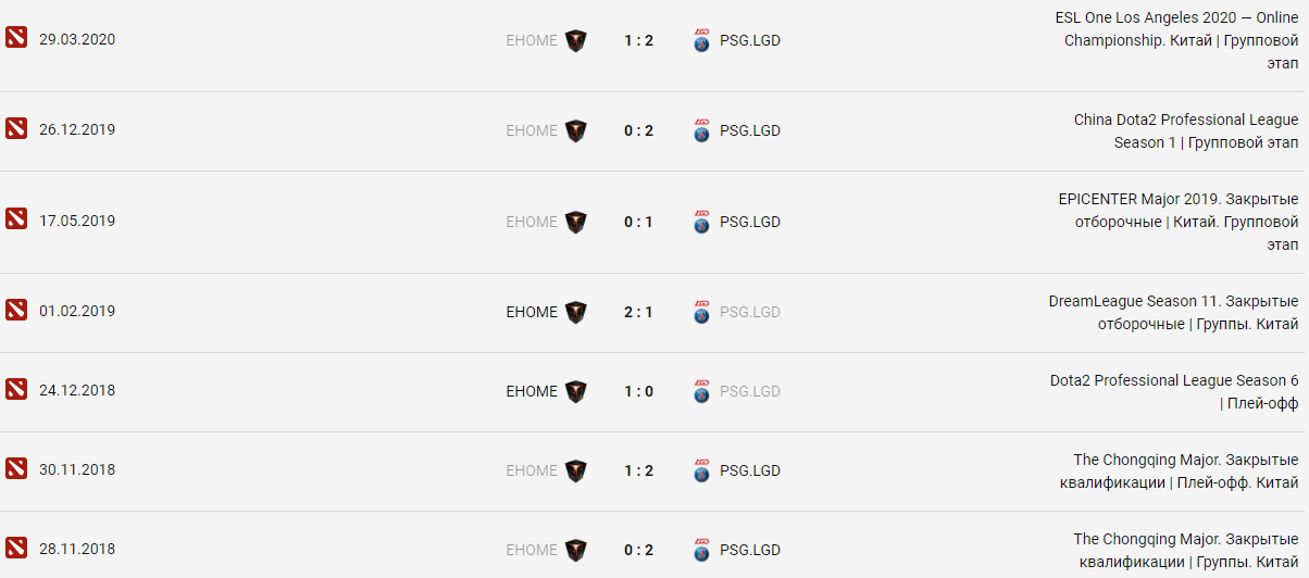 С точки зрения личного противостояния EHOME достаточно удобный соперник для PSG.LGD (24-12 в пользу PSG.LGD). Последние три матча завершились победой PSG.LGD. Один из поединков состоялся 29 марта в рамках ESL One Los Angeles 2020 — Online.