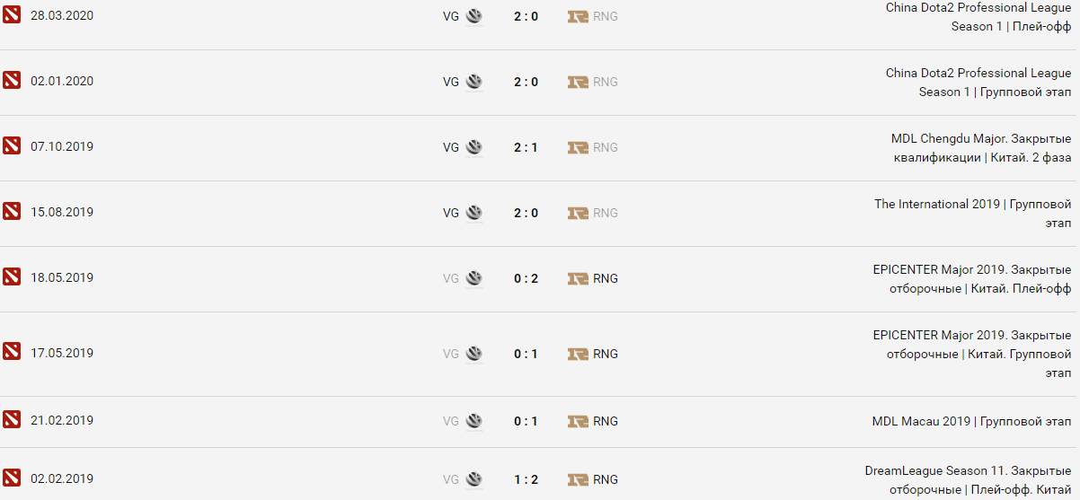 В 2019 году команды сыграли между собой 8 матчей, каждая из команд выиграла по 4 поединка. Стоит отметить, что последние 4 матча выиграла команда VG. Последний матч завершился буквально несколько часов назад. Победу со счетом 2:0 по картам одержала VG. Начало игры в 15:00 по МСК.