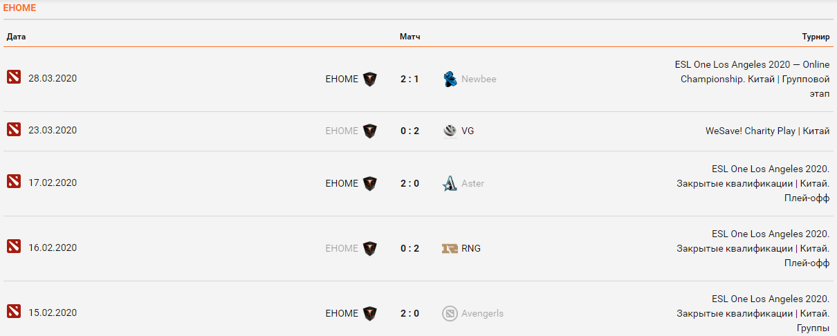 В 2020 году EHOME выступает нестабильно, победы чередуются поражениями. Но ей все-таки удалось удачно стартовать в китайском этапе ESL One Los Angeles 2020, выиграв у Newbee со счетом 2:1.