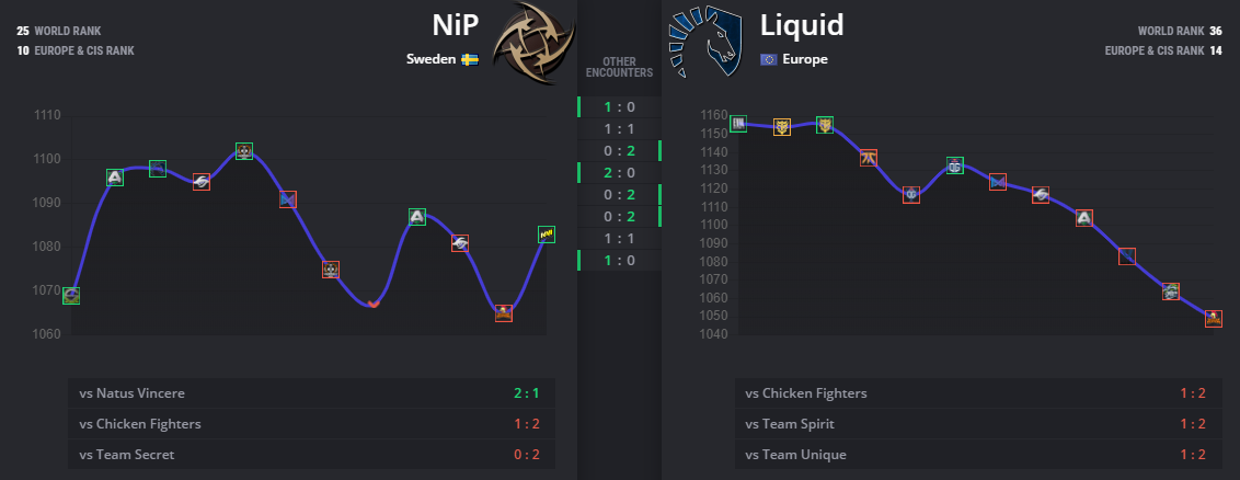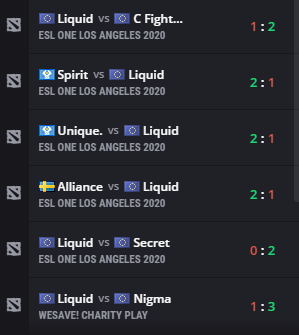 Team Liquid находится в печальном положении, она проигрывает в 5 последних матчах. На ее счету лишь 4 выигранных карт из 10. На данный момент нет никаких предпосылок, что ситуация изменится в лучшую сторону.