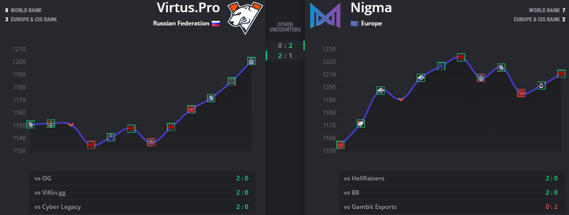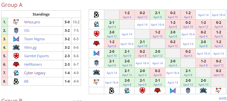 Российская команда Virtus.pro одна из тех, кто уже точно сыграет в стадии плей-офф. Она выиграла 5 матчей подряд и пока идет без поражений. Сначала "медведям" попадались не самые сильные противники, но в последнем туре ей удалось обыграть команду OG со счетом 2:0 по картам. Эта победа помогла VP заработать путевку в плей-офф. 14 апреля VP предстоит сразиться с еще одним серьезным европейским противником - Team Nigma. KuroKy & Co начали исправлять свое положение в группе, сейчас они идут на 3-ем месте (3-2), которое дает право лишь попасть в нижнюю сетку плей-офф. Все хотят занять как минимум 2-ое место в группе, чтобы начать путь в плей-офф с верхней сетки. OG продолжает ошибаться, а это значит, что Team Nigma попытается воспользоваться этим и будет стараться изо всех сил. Матч состоится 14 апреля, начало в 15:00 по МСК.