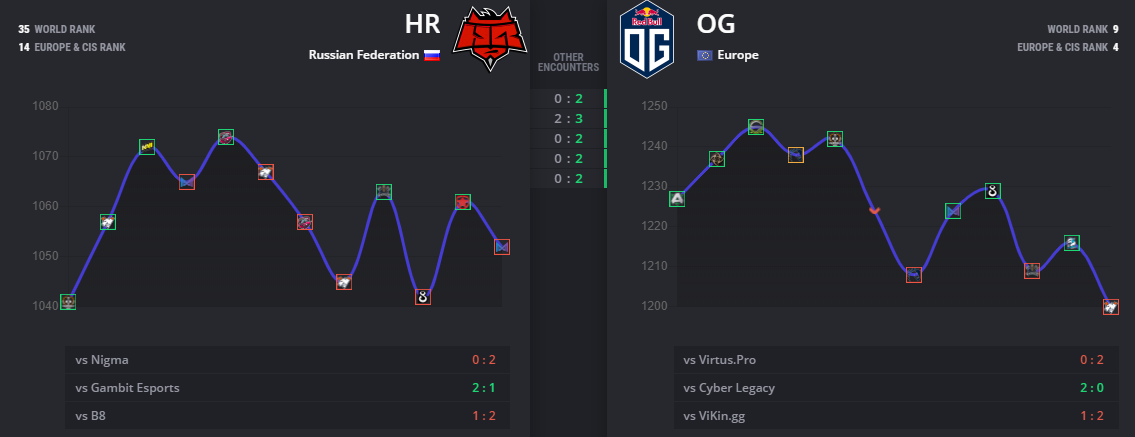 HellRaisers пока располагается на 6-ом месте со статистикой 2-3. СНГ-команде необходимо побеждать в последних двух турах, если она планирует продолжить участие в турнире. Таких серьезных противников, как OG команда HR еще не обыгрывала. По личным встречам у HR все также очень плохо. Последние 5 встреч завершились победой OG. Матч состоится 14 апреля, начало в 18:00 по МСК.
