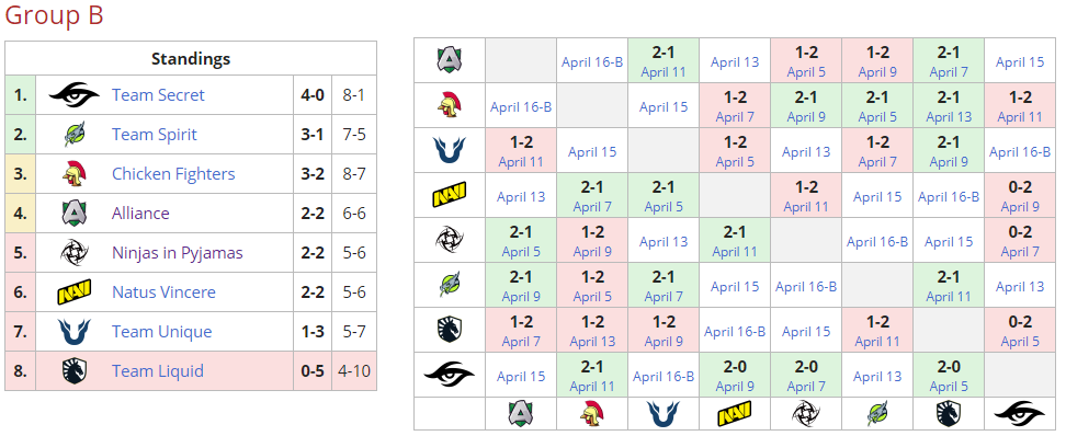 Alliance пока располагается на 4 месте со статистикой 2-2. На ее счету победы над Liquid и Unique, которые как уже выше сказано являются худшими командами группы В.