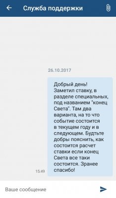 Интересно как контора объсняла бы расчет ставки в случае если конец света состоится. Нужно поиздеваться над службой поддержки в чате 1Хбет))