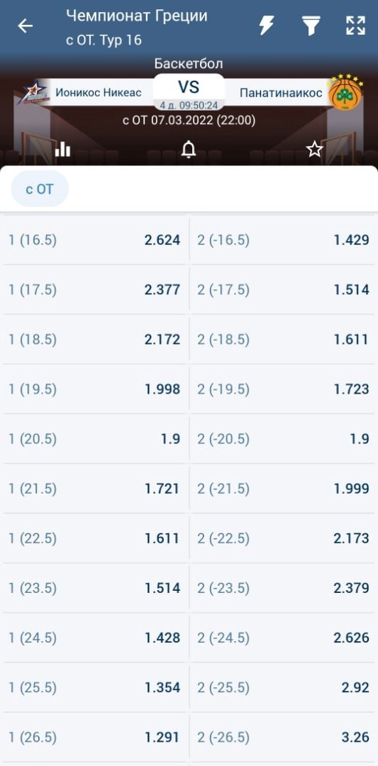 Давайте разберёмся на конкретном примере. В чемпионате Греции по баскетболу «Ионикос» встречается с «Панатинаикосом». Вторые — явные фавориты, а точка спреда расположена на отметке 20,5.