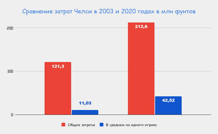 То есть в среднем за одного футболиста «Челси» этим летом заплатил £42,52 миллиона.