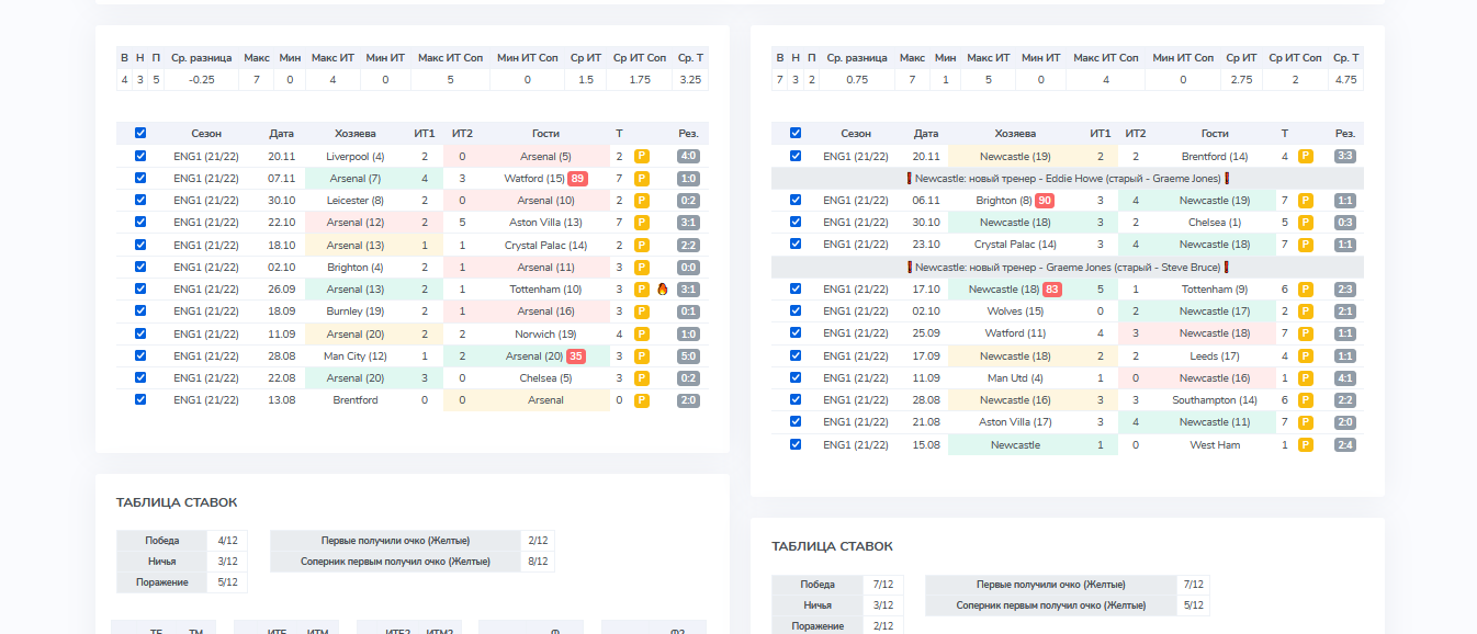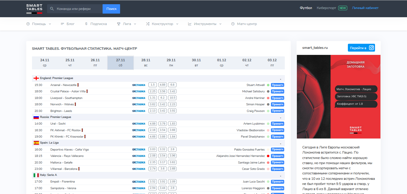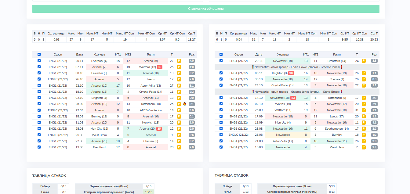 Владимир вскользь упомянул, что работал со Smart Tables, но обошёлся без подробностей. Я же продолжу тему и расскажу об одном из самых популярных статистических ресурсов подробнее, благо пользуюсь им абсолютно каждый день и даже записываю видео, как с его помощью нахожу валуйные ставки — вот пример. Ещё, кстати, делал небольшой гайд по ставкам на офсайды.