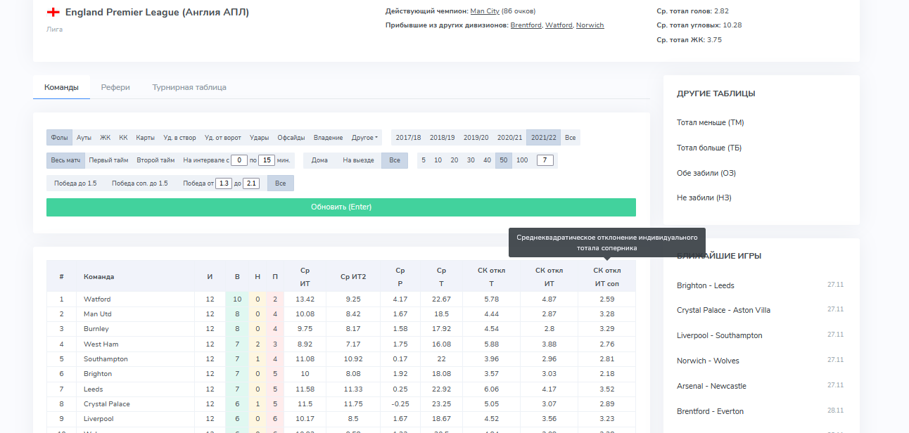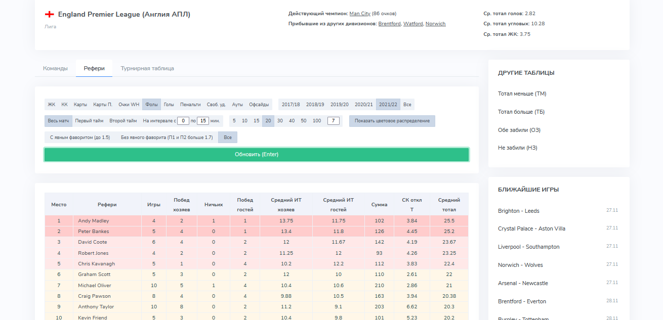 Ещё, если кликнуть на название лиги, то отобразится полная информация по ней. Например, жмём на АПЛ. Видим количество фолов каждой команды и можем сортировать клубы от самых грубых до самых аккуратных или наоборот. Всё то же самое по другим статистическим маркетам.