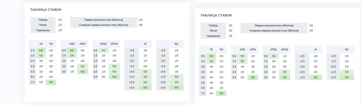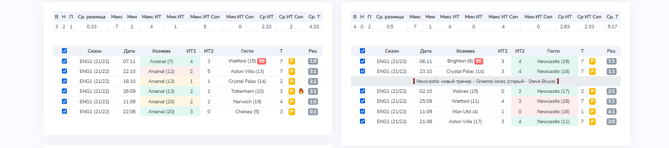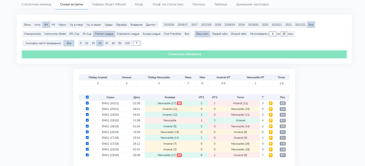 Цифры по хозяевам всегда находятся слева, по гостям — всегда справа. Видим статистику по нарушениям правил, а именно ИТ каждой команды, ИТ соперников и общий тотал. Сняв галочки, можно исключить любые матчи из расчётов. Это удобно, если вы, например, хотите посмотреть статистику только против топовых соперников или только в рамках какого-то одного турнира.