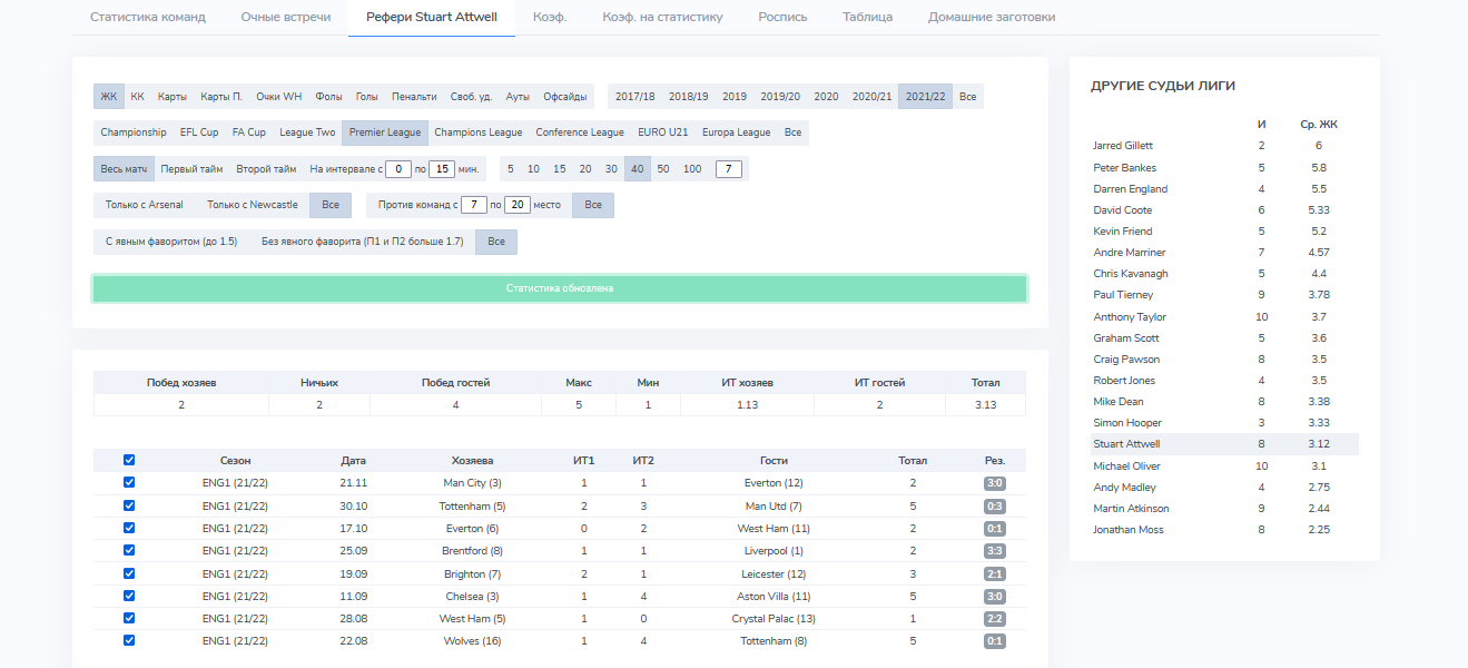 Далее показывается статистика по рефери. На выбранную игру уже назначен арбитр, поэтому сразу же видны его данные, которые, опять же, можно сократить до игр в АПЛ. Обратите внимание, что слева в колонке показывается расположение арбитра в таблице всех судей турнира и его статистика относительно других судей.