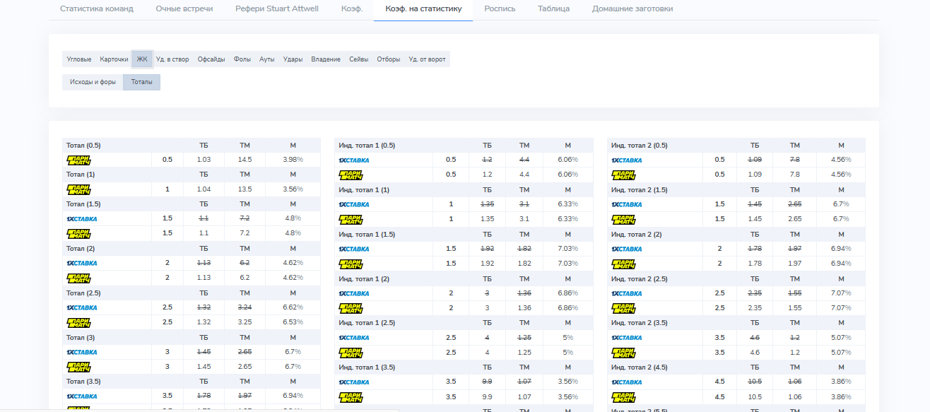 Следующая вкладка — жёлтые карточки. Здесь принцип тот же, а для удобства можно поставить фильтр по местному чемпионату. Нужны угловые, офсайды, удары и т.д. — просто открывайте нужную вкладку.