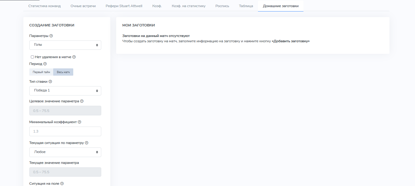 Нам важнее заключительный раздел — «Домашние заготовки». Что это за зверь? Это возможность настроить для себя своеобразные метки под лайв. Моделируете ситуацию, ставку и коэффициент — и когда в матче случается такая ситуация, бот в Телеграме мгновенно оповещает вас. Все настройки — слева.