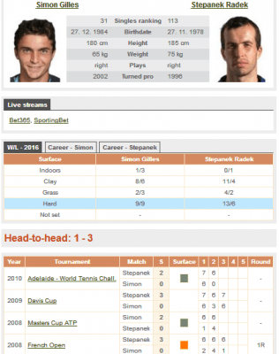 Волею жребия в пятый раз померятся силами два довольно-таких опытных спортсмена. Трижды в этих битвах сильнее был чешский спортсмен. Представитель Франции праздновал успех лишь один раз, однако последняя очная встреча произошла в 2010 году, поэтому эти цифры уже потеряли актуальност. Возвращаясь к предматчевым раскладам хочется сразу отметить, что Радек был вынужден участвовать в квалификационных раундах, дабы попасть в основную сетку. Штепанек одолел по пути в 1/64 финала Скугора, Микона и Вайнтрауба.