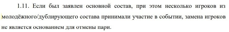 Основанием для возврата не считается и ошибка в обозначении возрастной категории неосновной команды: если в линии был заявлен состав U-19, а вышел U-21 — это уже проблемы игроков, которые наставили на этот матч.