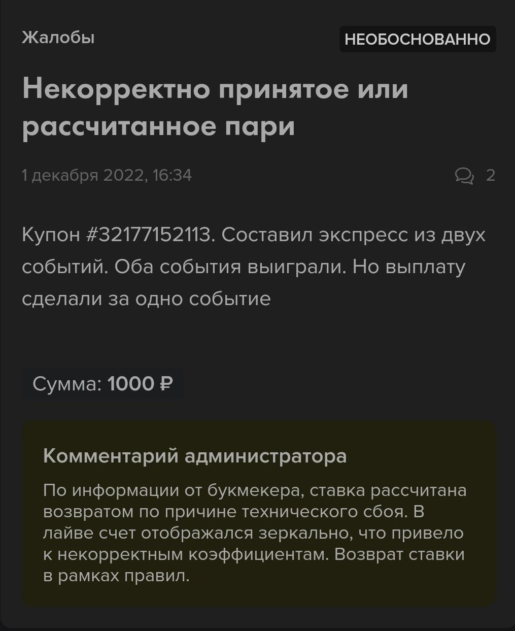 Обратимся за примером к жалобам игроков на «Легалбет»: игрок составил экспресс из двух событий, оба прошли, но контора рассчитала одно из них возвратом из-за технического сбоя: в лайве счёт отражался зеркально, что привело к некорректным коэффициентам.