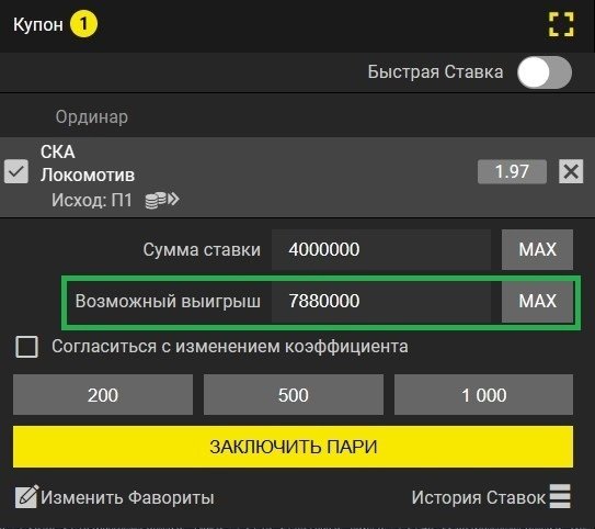 7. Если суммарный выигрыш нескольких ставок на зависимые исходы превышает максимальный выигрыш, установленный БК. Букмекерская контора устанавливает максимальный выигрыш для конкретного исхода. Даже если он не указан отдельно, его можно легко посчитать, перемножив коэффициент и максимальную сумму ставки.
