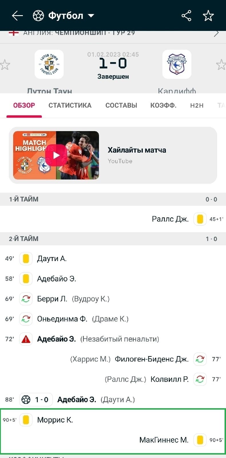 Если жёлтые карточки, голы или угловые у обеих команд случились на одной и той же минуте, а в итоговом протоколе значатся с одинаковым временем, то все ставки маркетов «Кто раньше получит ЖК / забьёт гол» или «Кто получит следующую ЖК / забьёт следующий гол» будут рассчитаны с коэффициентом 1.00.