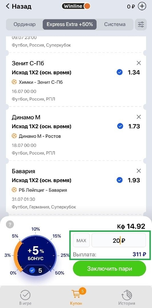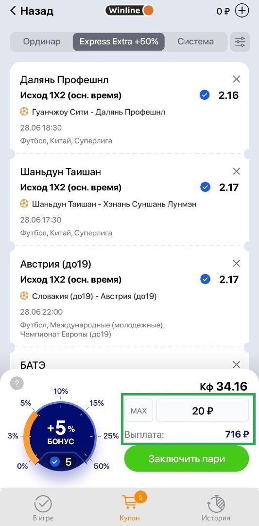 Поэтому обращают на себя внимание Winline и «Олимп»: там чем больше матчей в «паровозе», тем больше процентов накидывают к потенциальному выигрышу. В Winline потолок 50% за 14 событий, а у «Олимпа» вообще до 100% за 20 матчей.